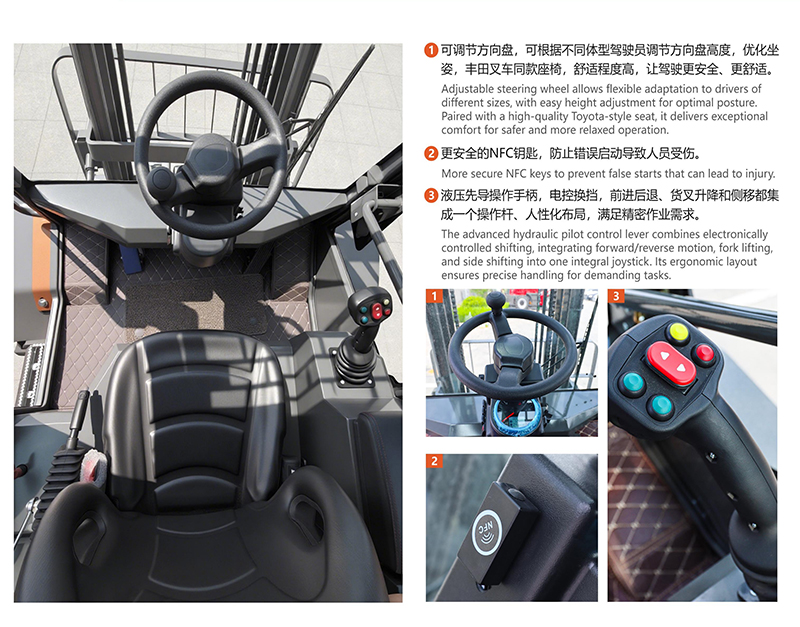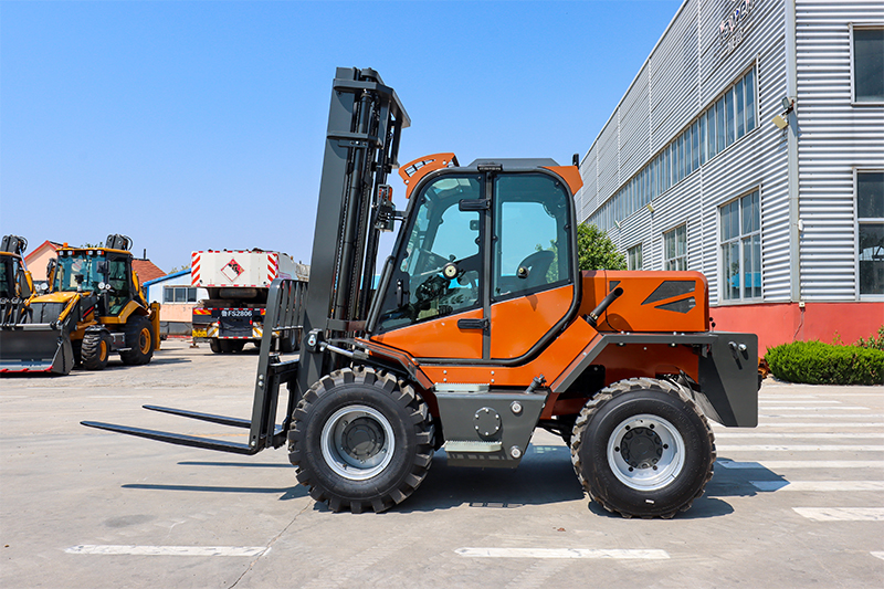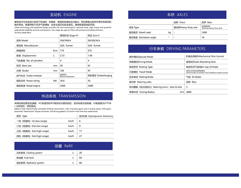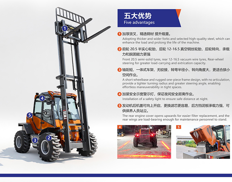 一體式越野叉車(YW35T)為加厚貨叉,精選鋼材提升載重,前輪20.5半實(shí)心輪胎,后輪12-16.5真空鋼絲輪胎,后輪轉(zhuǎn)向,承載 力和脫困能力更強(qiáng),軸距短,一體式車架,無鉸接,轉(zhuǎn)彎半徑小,轉(zhuǎn)向角度大,更適合狹小 空間作業(yè),加裝安全示寬警示燈,保證夜間安全距離作業(yè),發(fā)動機(jī)后機(jī)蓋可向上開啟,更換濾芯更容易,后方擋泥板承載力強(qiáng),可 供保養(yǎng)人員站立。